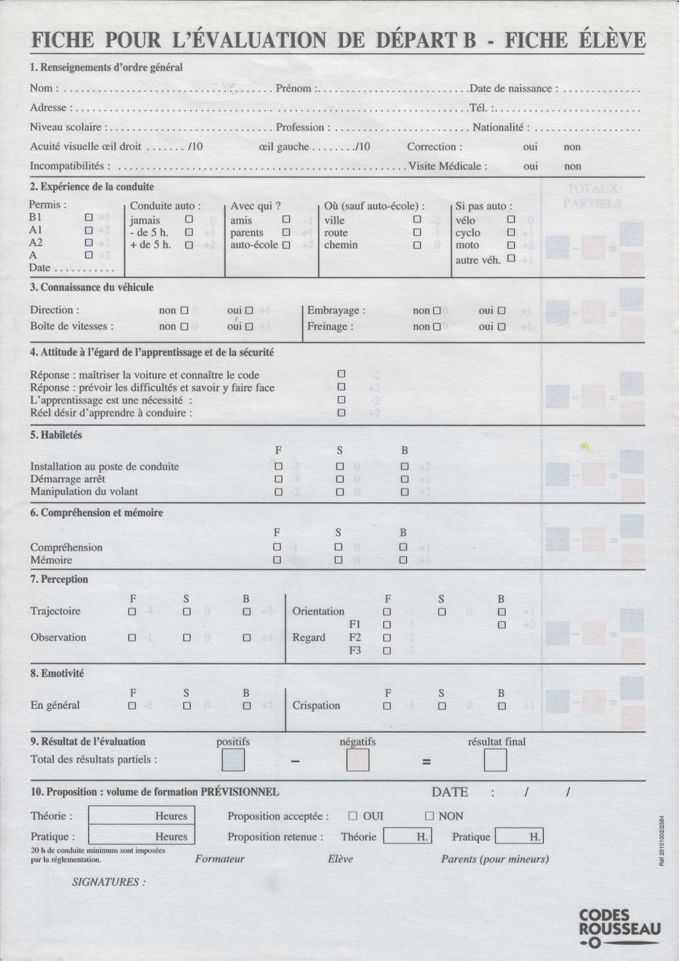 Cette évaluation est obligatoire et payante au prix d'une leçon de conduite et doit être faite avant toute inscription dans une auto-école et le début de votre formation.